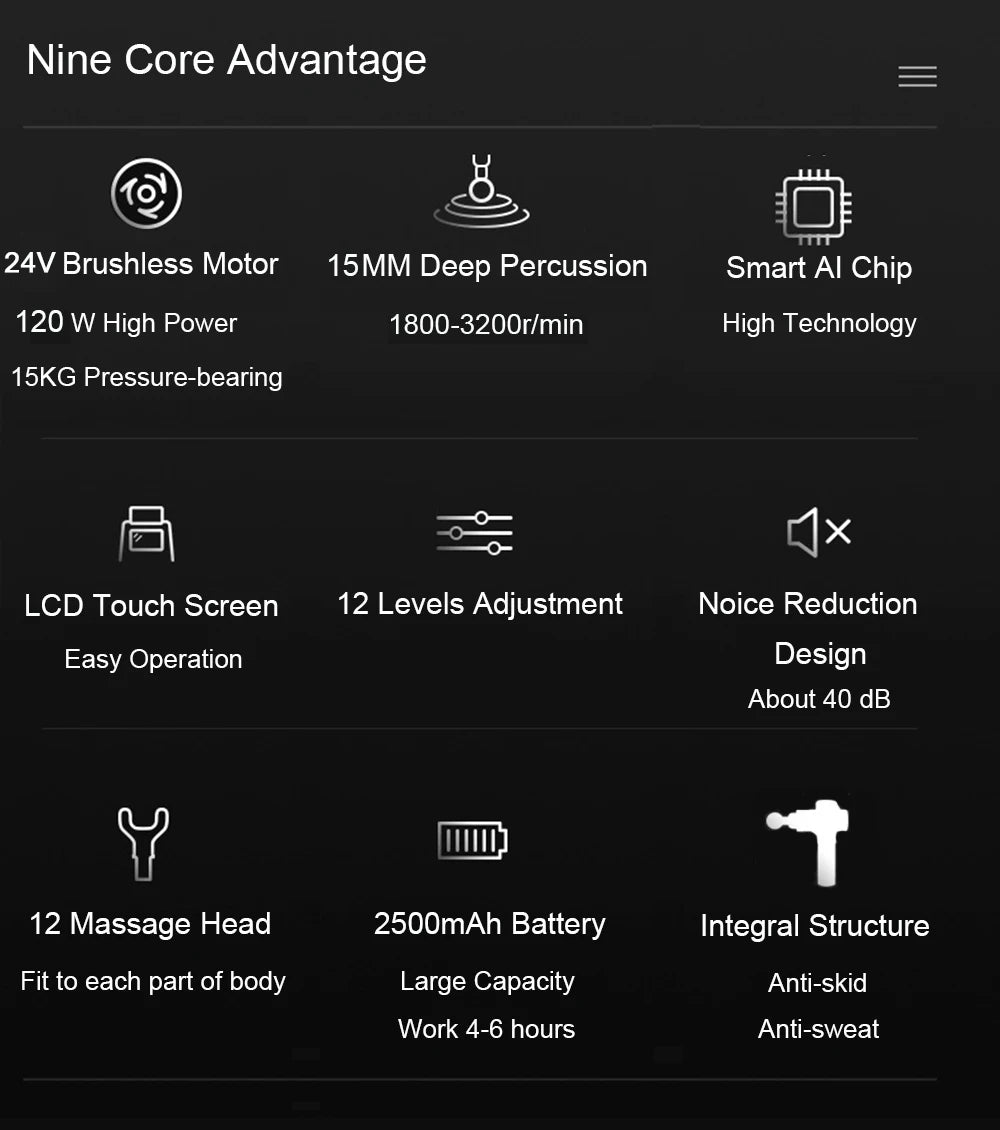 12 Interchangeable Heads – Designed for every muscle group from neck to legs.